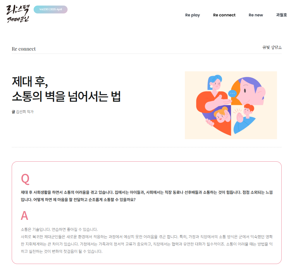 [국가보훈부 리스펙 제대군인 칼럼] 4월호 [ 금빛 상담소] "제대 후, 소통의 벽을 넘어서는 법"